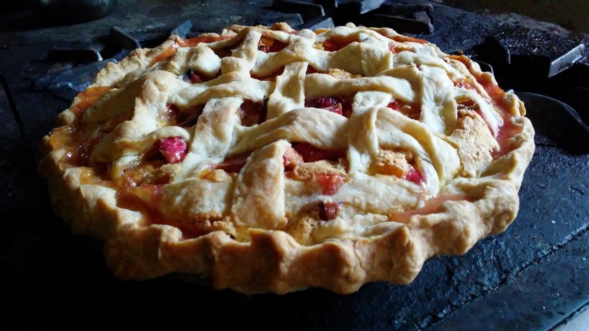 She bakes hers for an hour and a quarter at 350 degrees Fahrenheit, sometimes reducing the temperature to 325 degrees for another 10 minutes or so if she thinks it’s not quite done. How long you bake it will depend a little on your pastry recipe. Because it was a hot day, my pastry felt a little soft so I started mine at 375 degrees for 10 minutes to set the crust then reduced it to 350 degrees for another hour and ten minutes.
